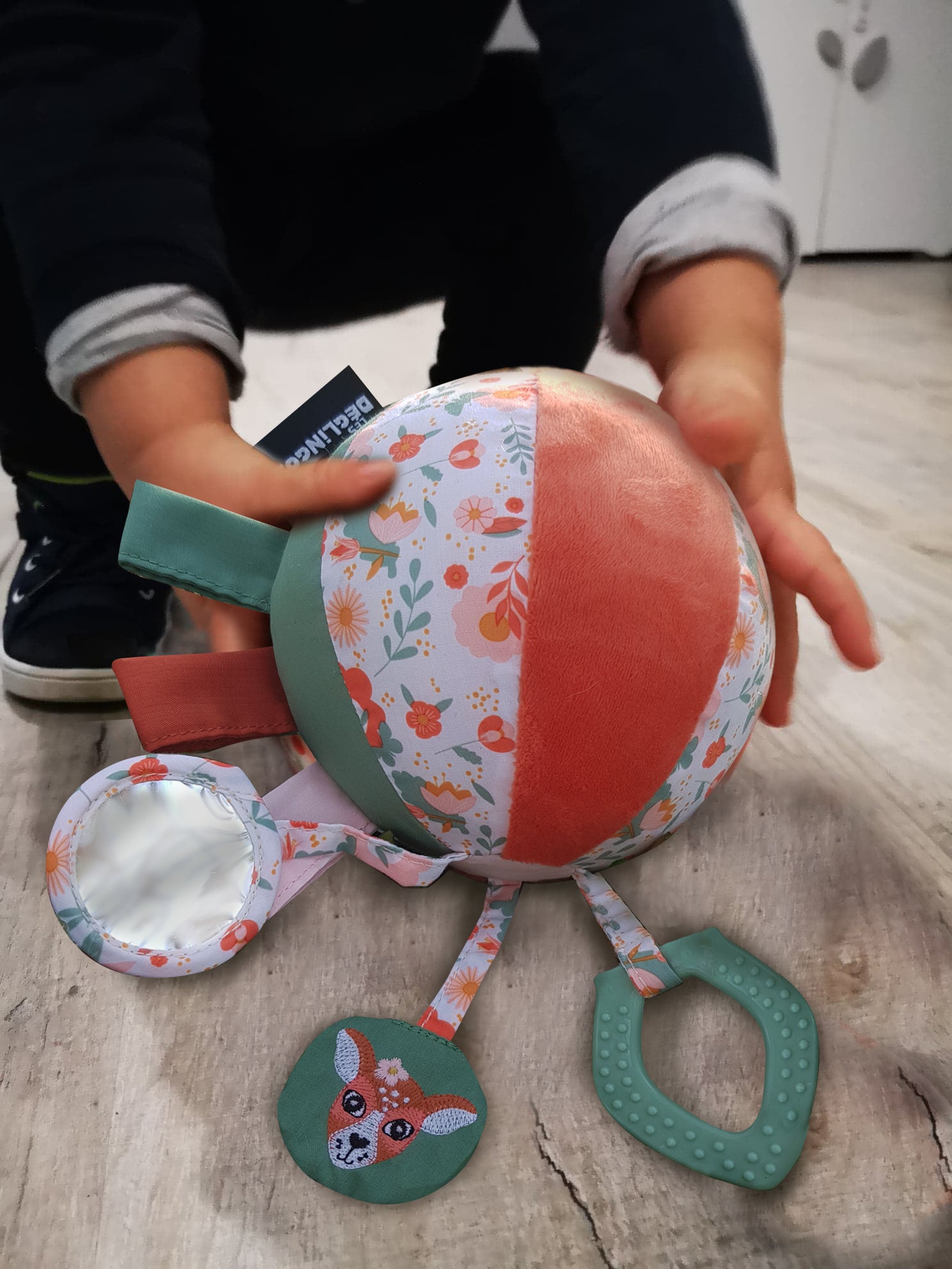 Soft and suitable for small hands! A small, soft fabric ball that is easy to catch for little guys! It's guaranteed fun thanks to all these sound and tactile accessories! Original and colourful, this activity ball will occupy baby in the stroller, the bed and on a play mat!
