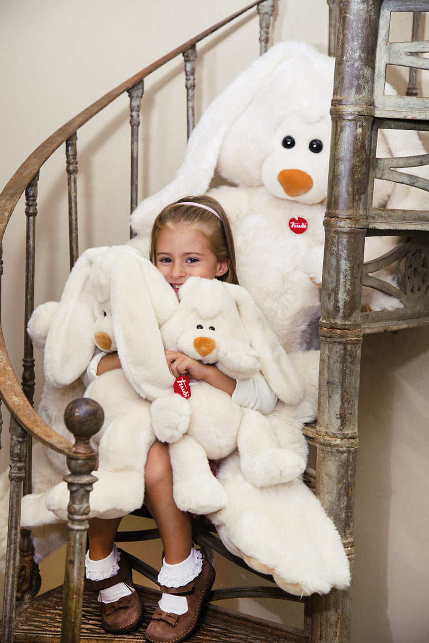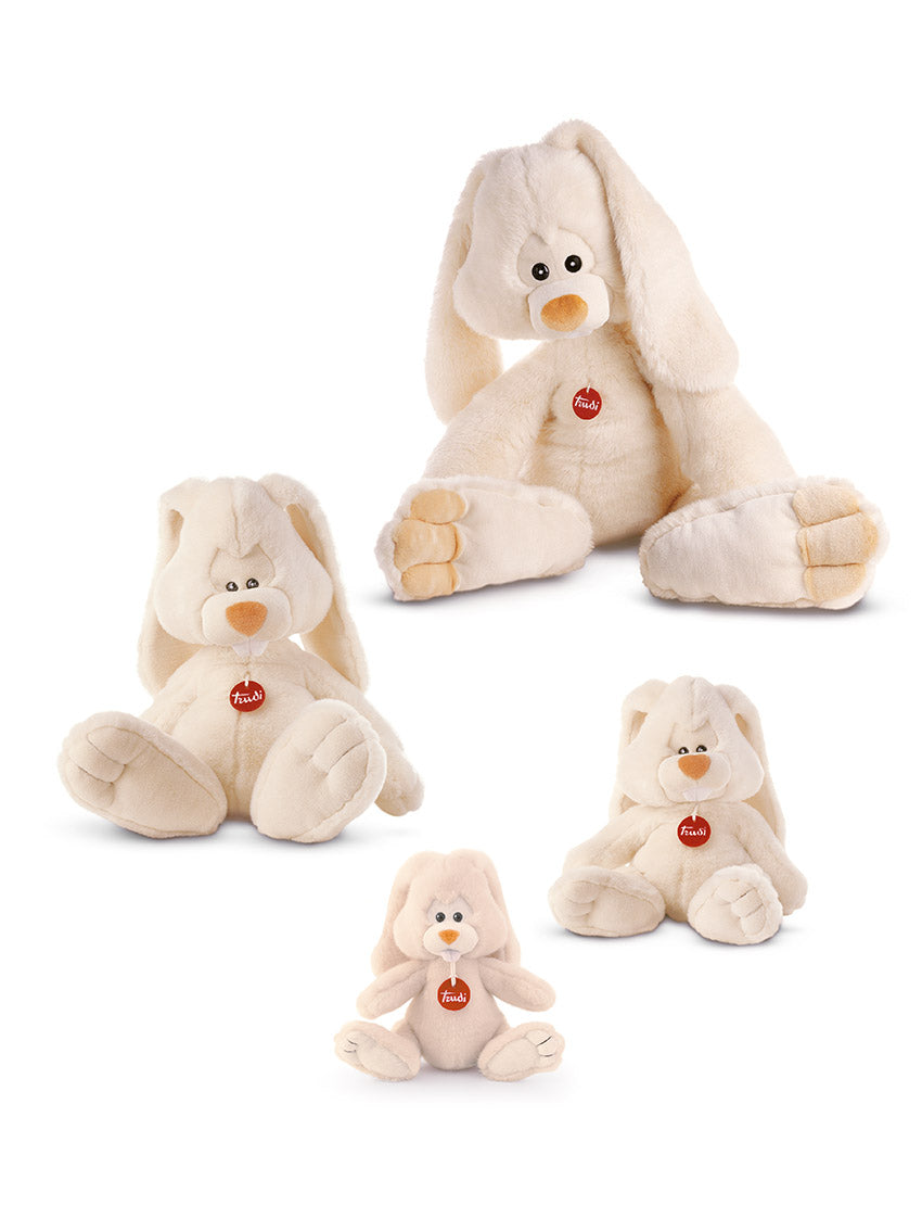 The Virgil Rabbit is the symbol of Trudi. All the sweetness and care taken in making it transpire in him. Characterized by large feet and long floppy ears, it transmits an overwhelming adorability which is reinforced by its unmistakable endearing tone of charming huggableness. It has a top quality hair and two large black eyes that penetrate hearts, melting them. It comes in four sizes ranging from small to maxi jumbo.