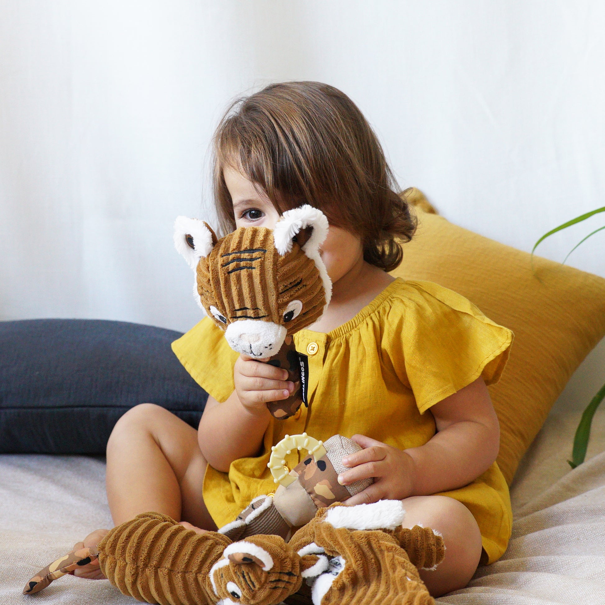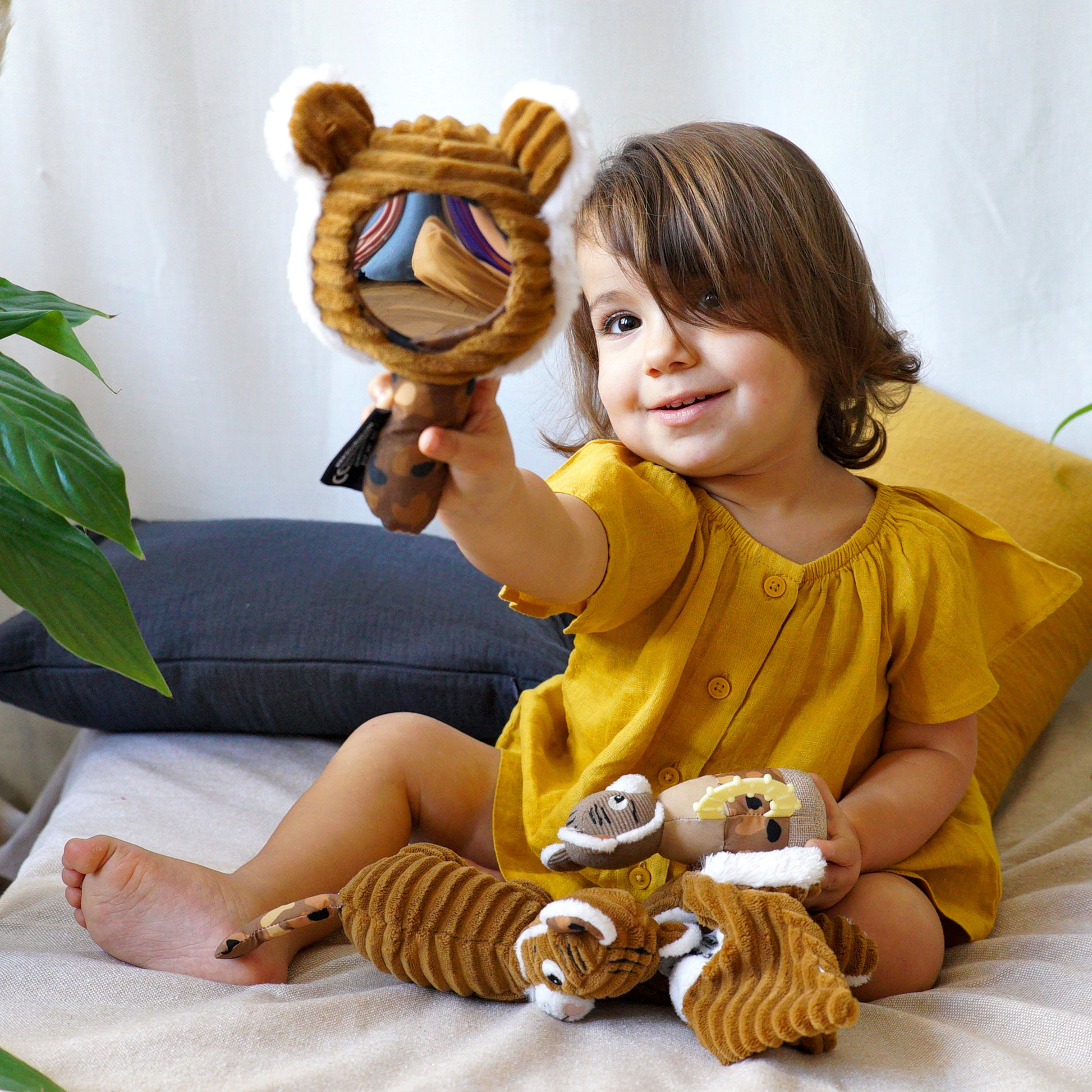 Activity rattle & teether Discovering life and having fun with Deglingos is coolos! With different sounds and sensations, this Rattle combined with Teether and touch sensitive fabrics puts the rhythm in your baby's rattle and shake. An awakening senses toy within reach of small hands and itchy teeth! size: 19cm.