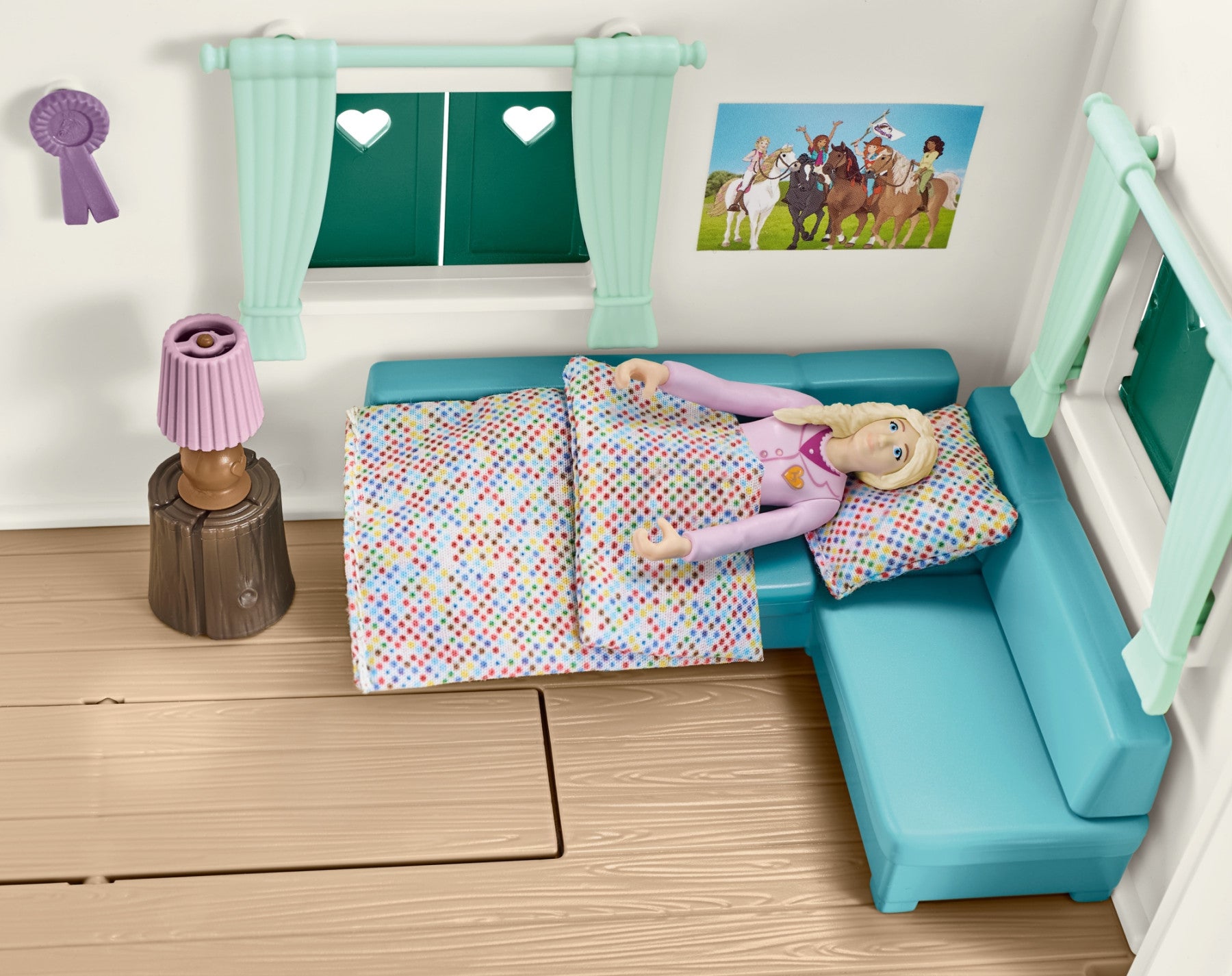 1 x fully flexible figure, 1 x Andalusian Mare, 1x squirrel, 1x stall, 2x lanterns, 1x ladder, 1x chair, 1x sunshade, 1x outdoor table, 1x sofa, 1x living room table, 1x lamp, 1x window box, 1x rope ladder, 2x winner rosette, 1x saddle, 1x bridle, 1x rein, 1x halter, 1x hay rack, 1x comb, 1 x grooming brush, 1x straw bale , 1x bucket, 1 x apple, 2x cushion, 1x campfire, 1x bottle, 2x barbecue stick with sausage, 2x cup, 2x mug, 1x bowl, 1x plant pot, 3x wooden log, 1x sticker, 1x assembly instructions Box