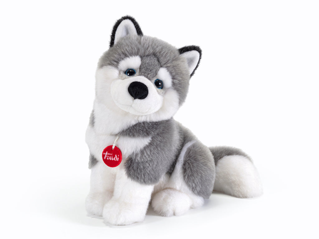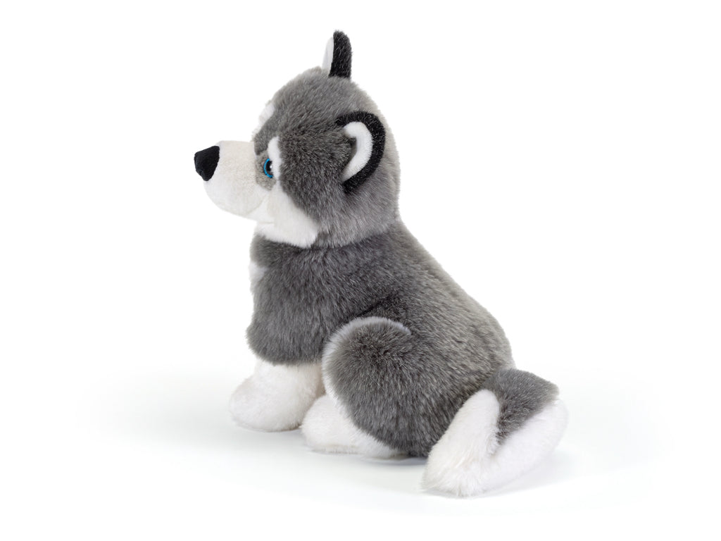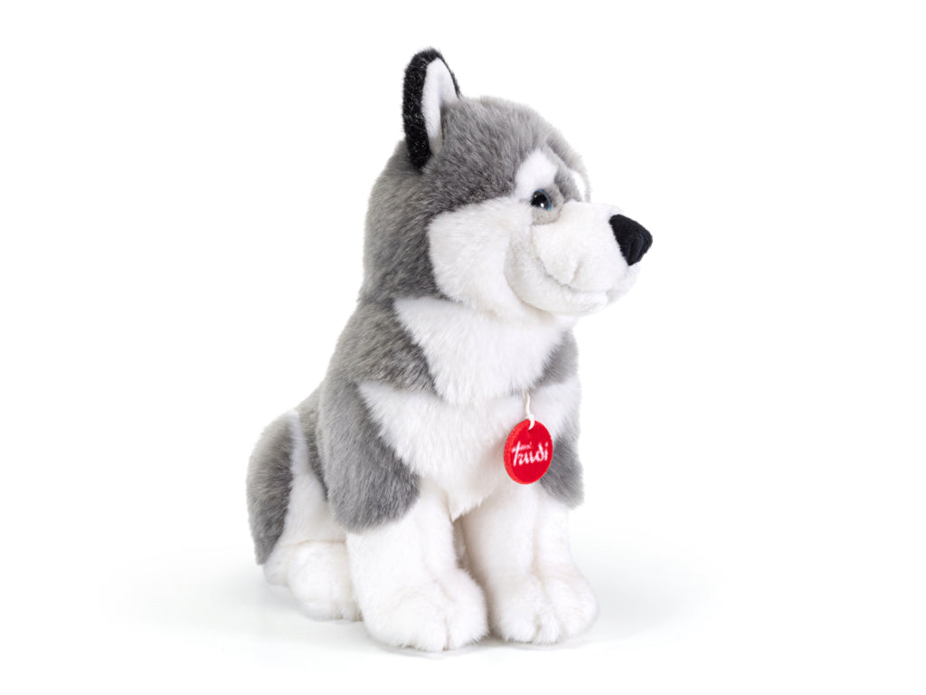 The fur and colors used faithfully represent the Siberian Husky. The detail of the ears, the alternation of grays and whites as well as the thick tail give it a realistic touch. The position is on all fours and the interpretation is like a puppy.