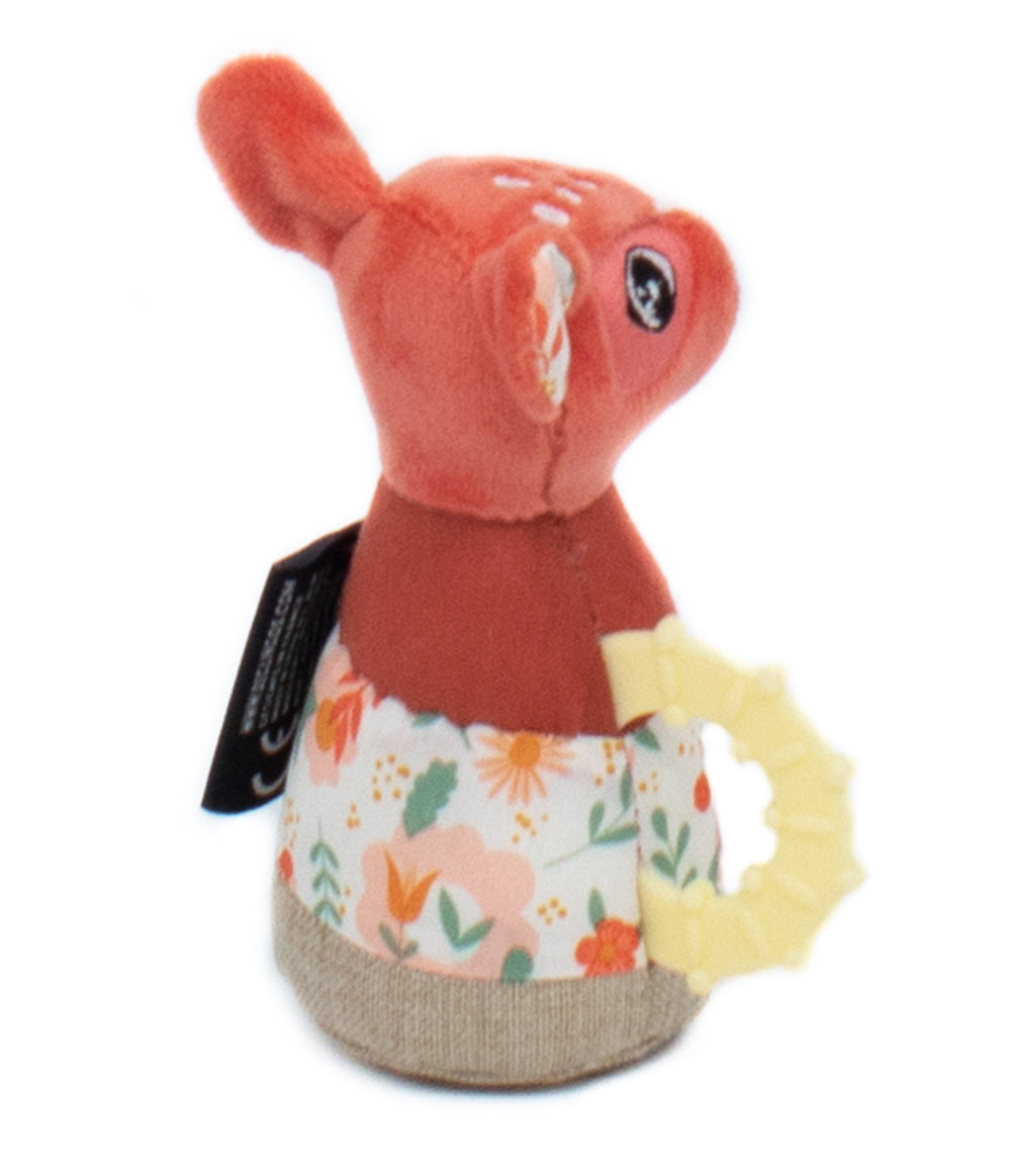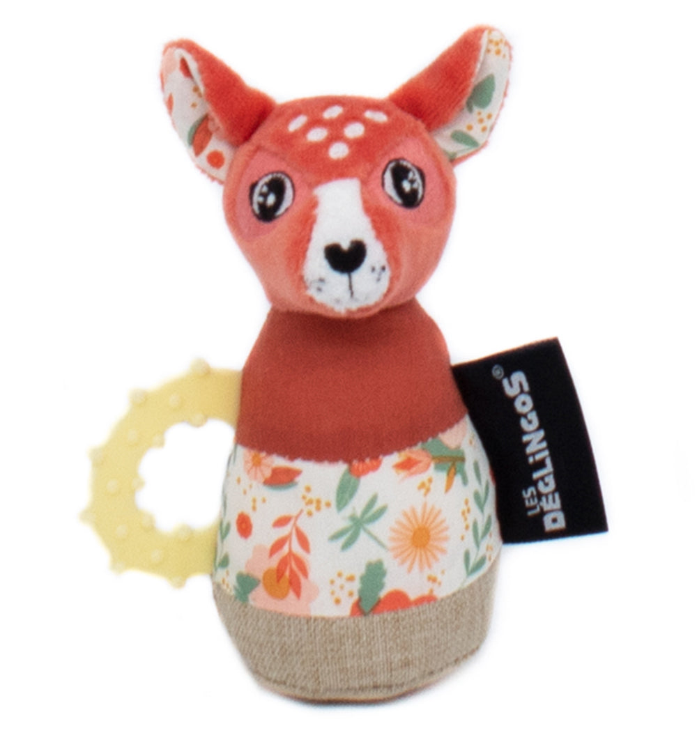 Activity rattle & teether Discovering life and having fun with Deglingos is coolos! With different sounds and sensations, this Rattle combined with Teether and touch sensitive fabrics puts the rhythm in your baby's rattle and shake. An awakening senses toy within reach of small hands and itchy teeth! size: 19cm.