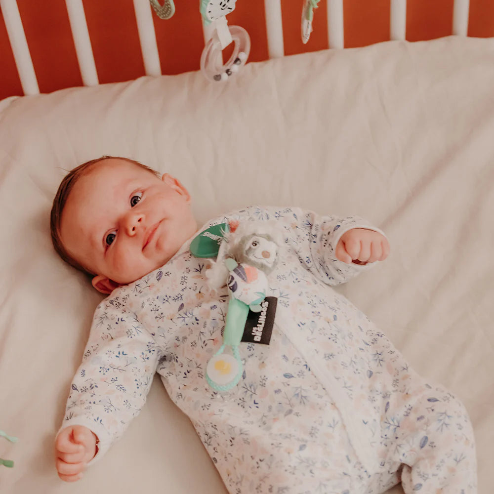 The Déglingos pacifier clip attaches easily to clothing with its plastic clip so a pacifier is always within reach! More than an accessory, the green Chillos the sloth pacifier clip is equipped with a small soft toy that delights baby during play or sleep time!