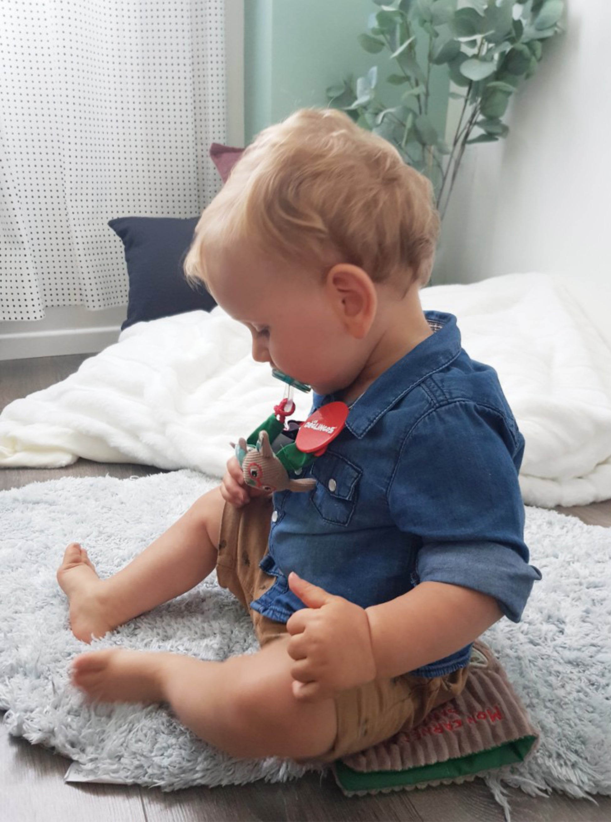 Fix the plastic clip on the clothing for a pacifier with easy reach.