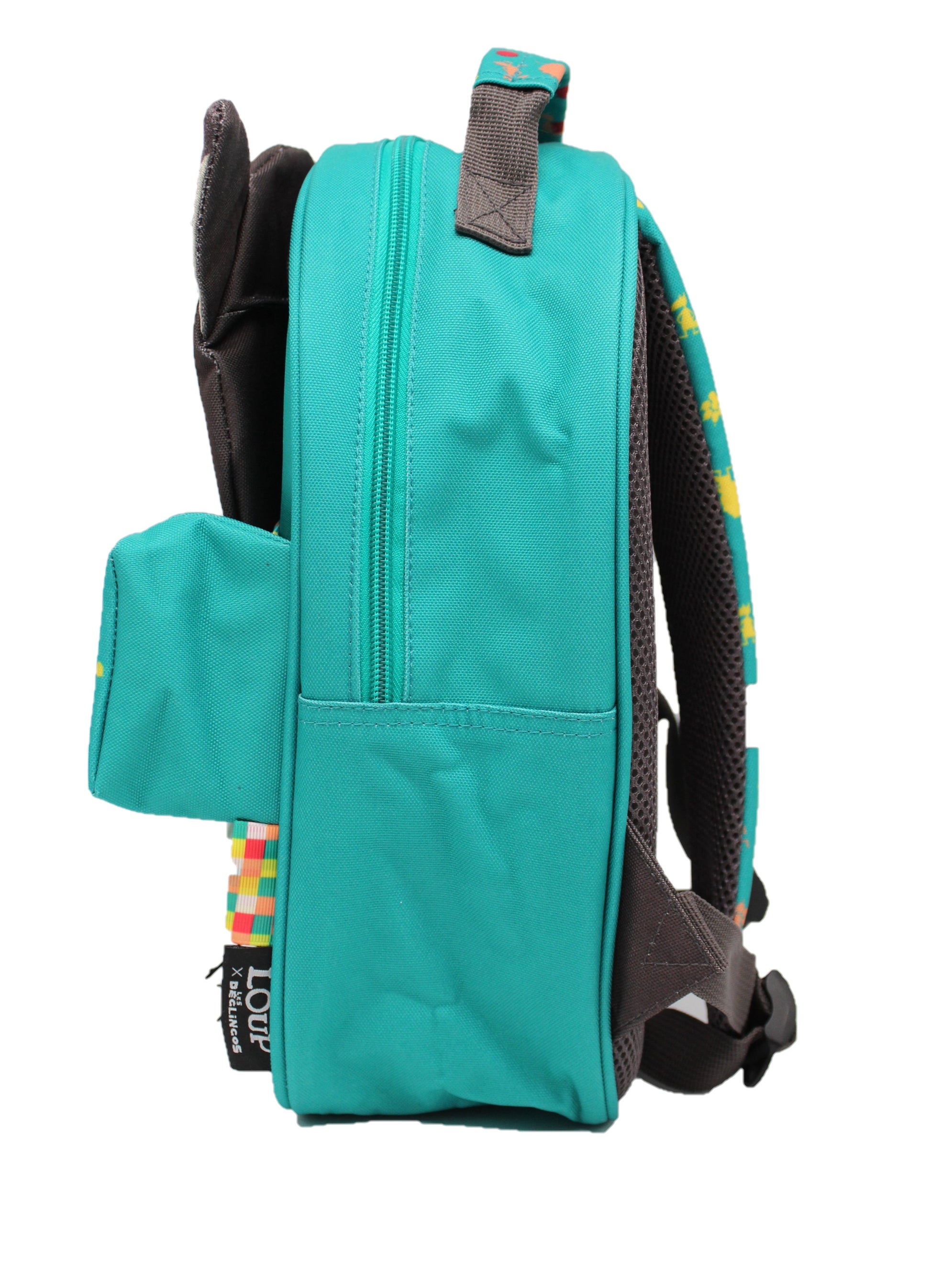 The nylon backpack with the image of Loup X the sloth is green and colorful.