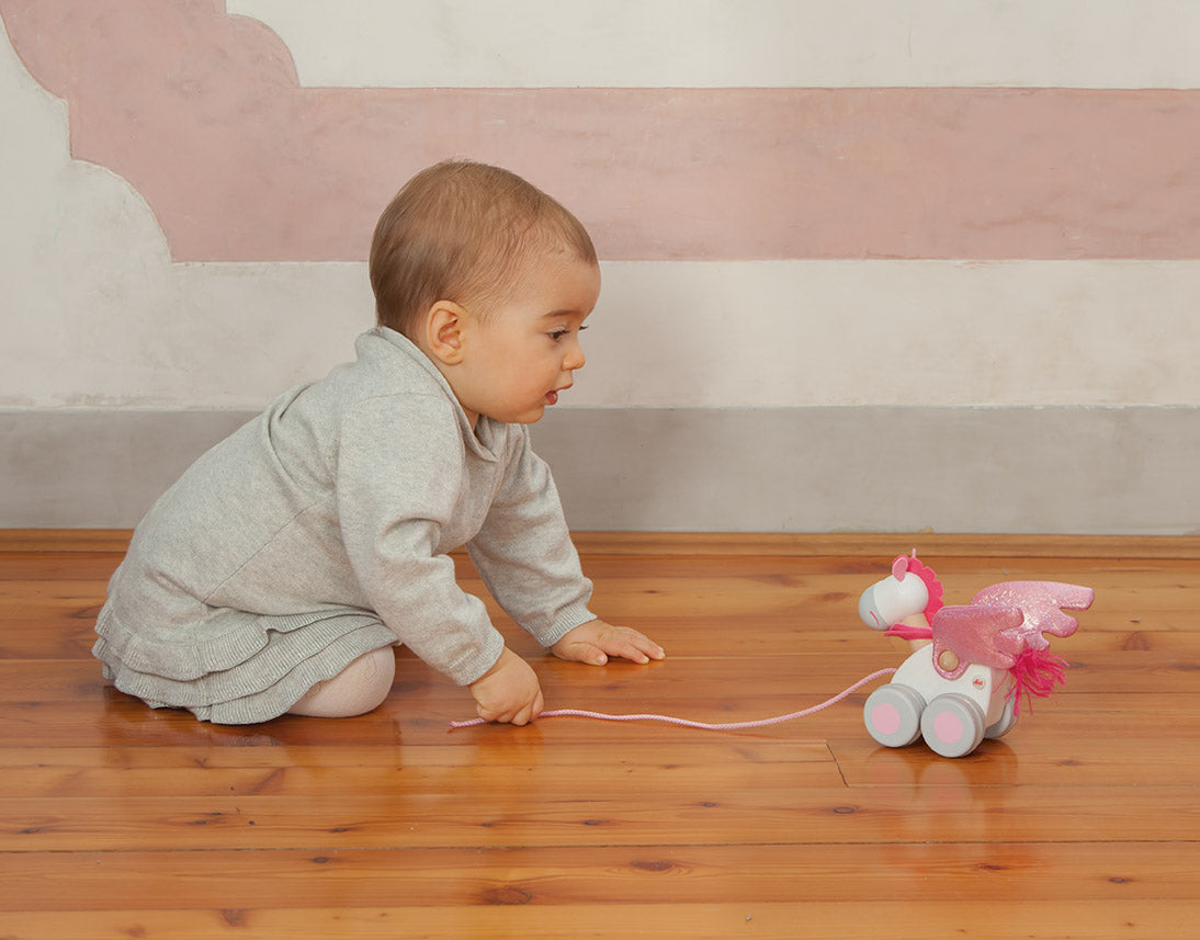 The Sevi Towables / Pull Alongs are cute animals made of wood, decorated with soft and delicate colours. Perfect for children aged one year and up, they help develop motor skills, balance and coordination, becoming the ideal friends to take their first steps. Pulling on the string, this cute reindeer moves forward in a cute swaying motion.