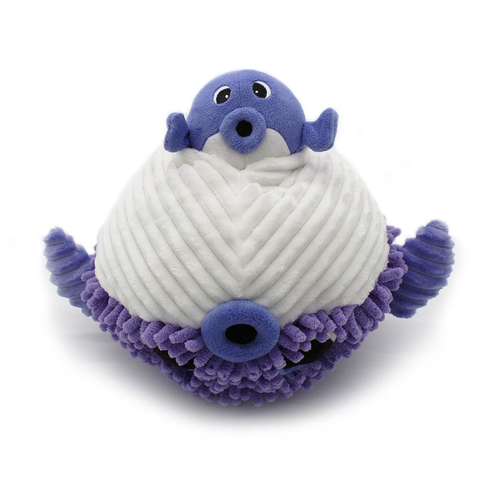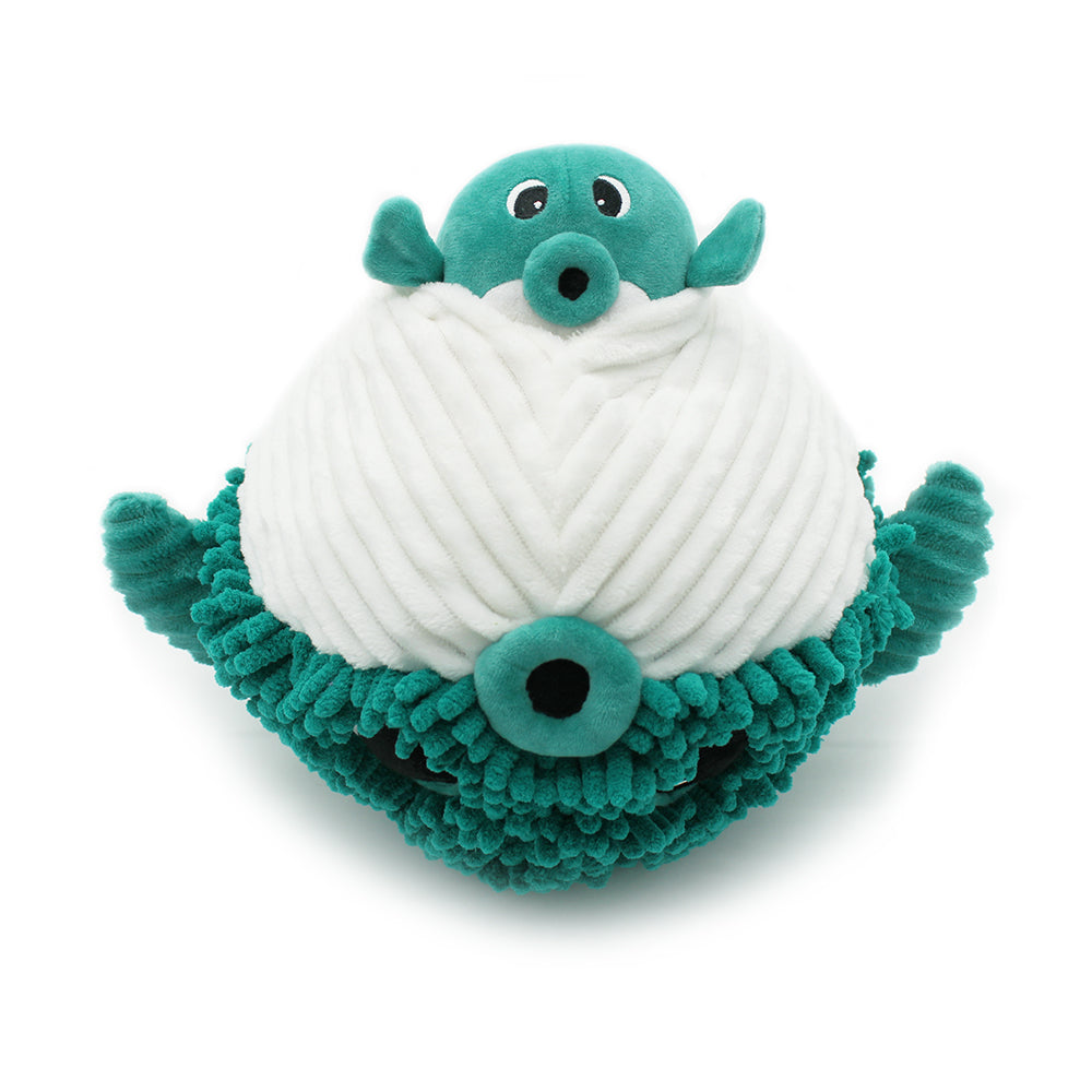 The green Ptipotos blowfish plush toy is sold with its baby hidden under its belly. The 31cm plush toy is very soft in corduroy and terry cloth.