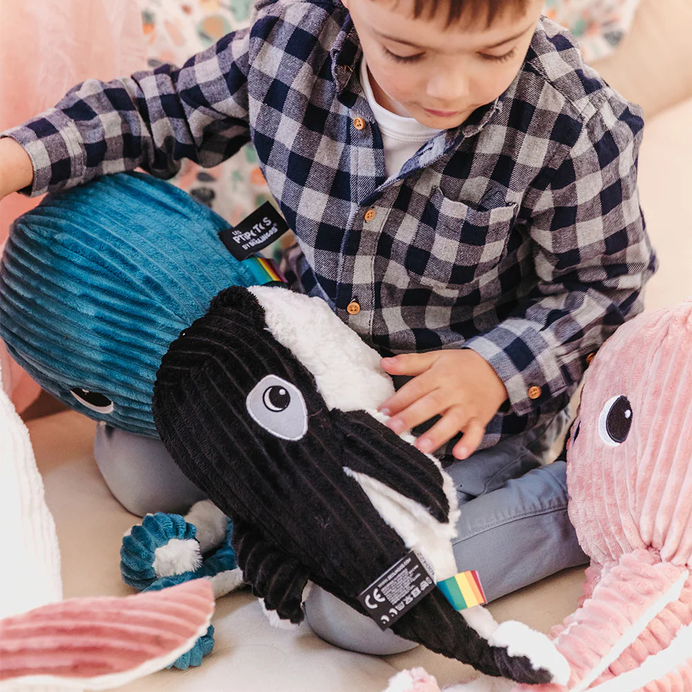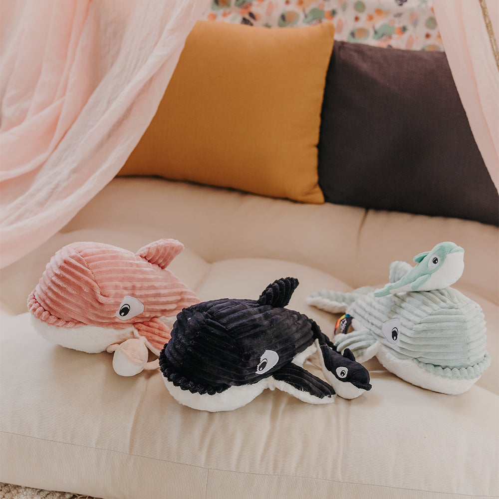 This 35 cm orca soft toy is made of corduroy and very soft. Available in Black, Mint Green and Pink.