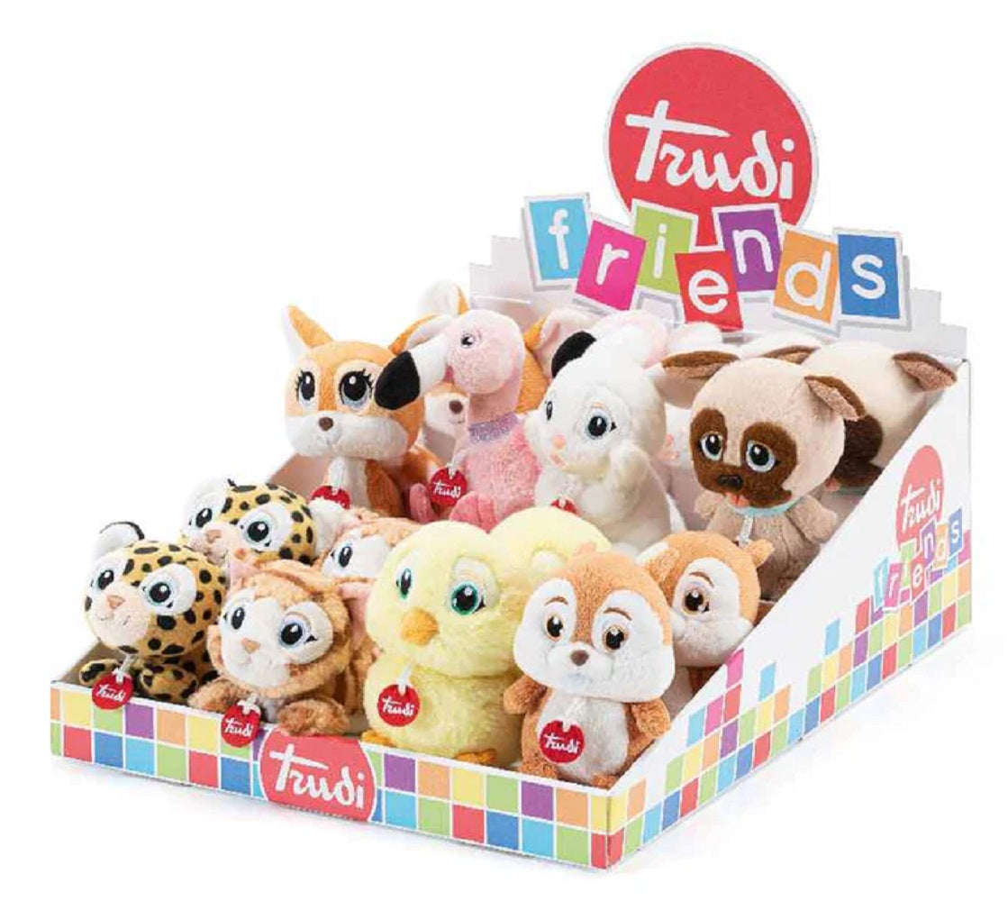The Trudi Friends Pug is characterized by a delicate blue collar, a cute pink tongue and large eyes embroidered on a sweet and tender face.